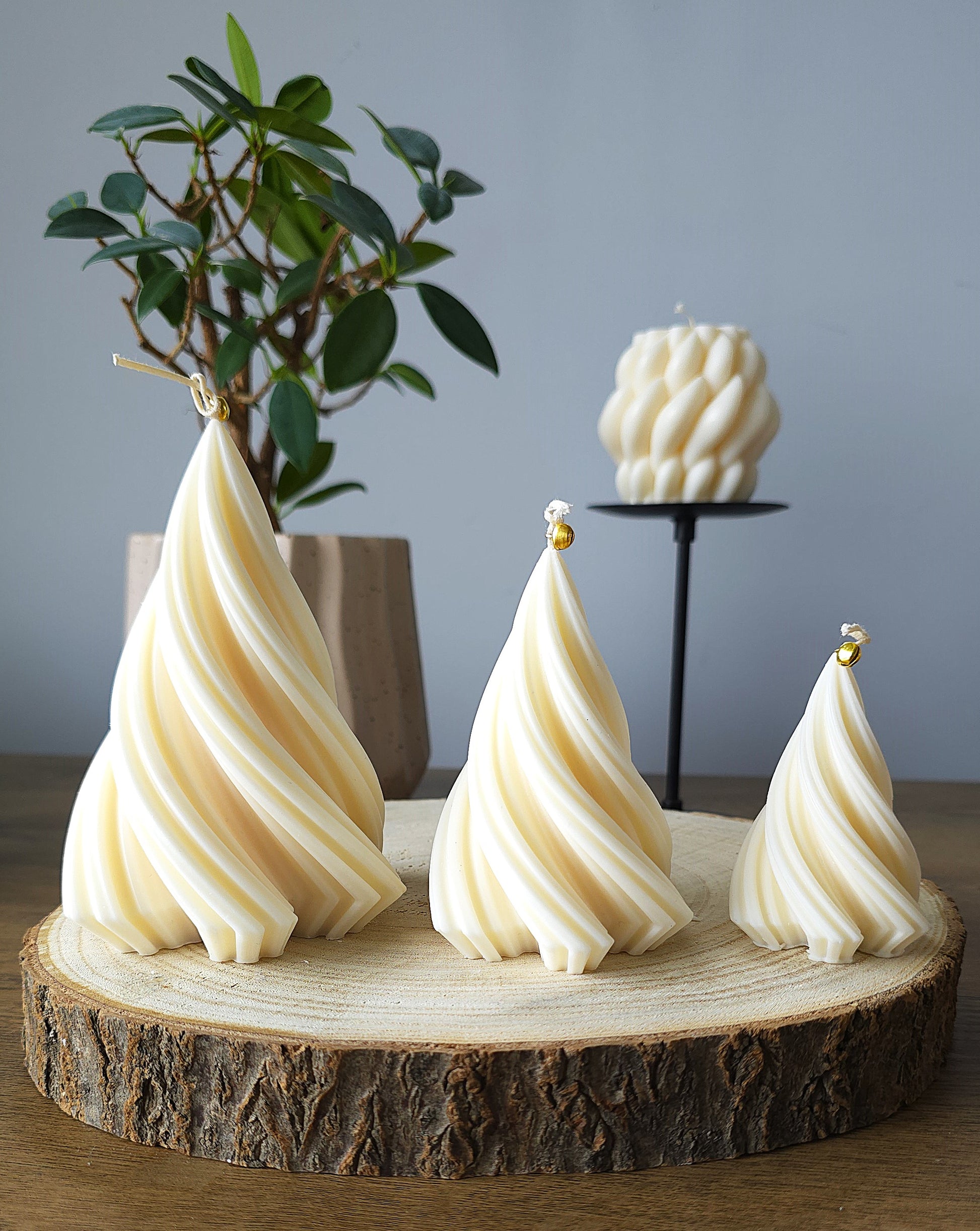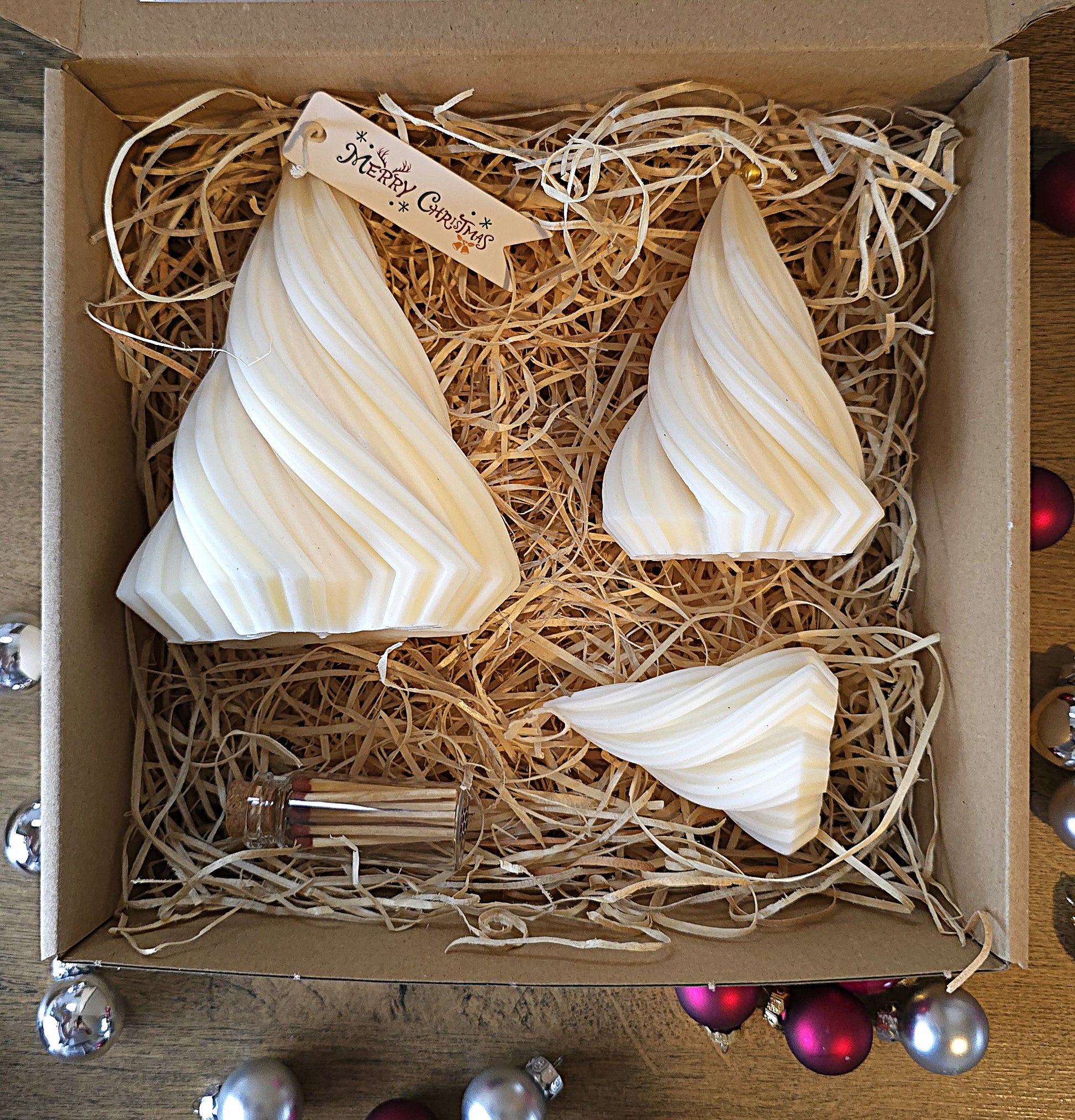 Deze feestelijke cadeauset bevat drie spiraalvormige kerstboomkaarsen in verschillende formaten: