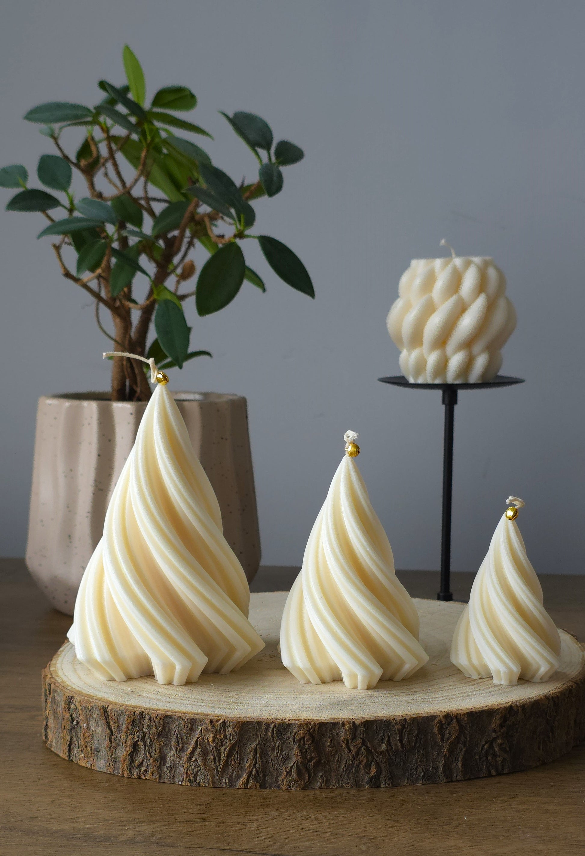 Creëer een magische kerstsfeer met de Christmas Tree Kaars Set, bestaande uit grote, medium en kleine spiraalvormige kerstboomkaarsen.