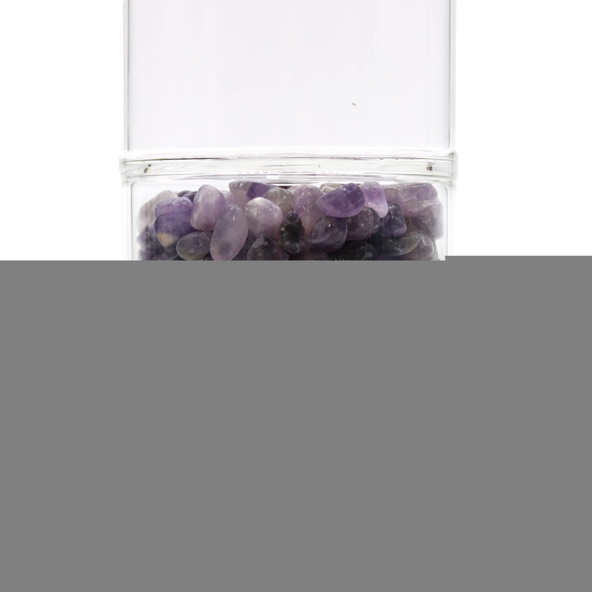 De amethiststenen in de fles zorgen voor een mooie en rustgevende uitstraling. Amethist staat bekend om zijn kalmerende eigenschappen en zou ontspanning en rust bevorderen. De stenen zitten stevig vast in de bodem van de fles en voegen een mooie touch toe aan het algehele ontwerp.