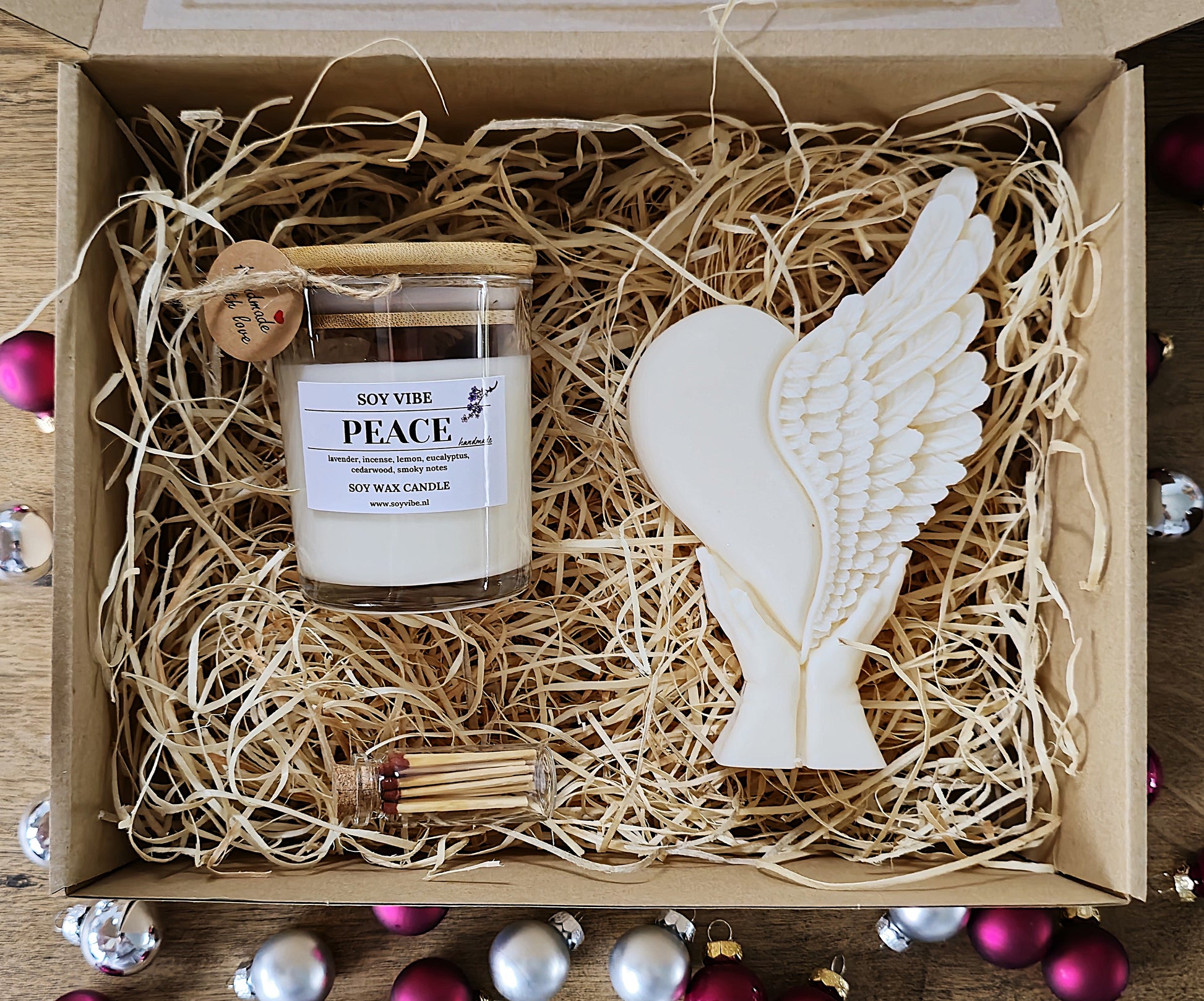 Deze betekenisvolle cadeauset bevat een True Vibe-kaars naar keuze uit onze collectie, samen met de elegante Heart & Feather Hands-kaars.